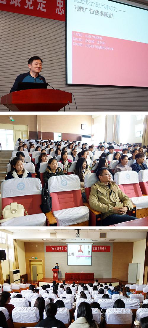 3月18日下午,在学校图书馆一楼报告厅,艺术学院视觉传达教研室举办“问鼎广告赛事殿堂”专业讲座。邀请山东建筑大学倪鹏飞副教授主讲。视觉传达设计专业教师赵崇立、史磊,以及12级、13级、14级本、专科生,共120余名同学聆听了讲座。