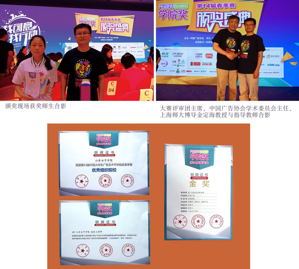 近日,我院学生参加中国大学生广告艺术节“学院奖”喜获佳绩,颁奖盛典在中央电视台梅地亚中心隆重举行。视觉传达设计专业赵崇立老师指导的2013级视传专业颜林杰同学广告设计作品《京润珍珠系列篇》荣获大赛金奖并获得5000元奖金。同时,多名同学荣获优秀奖和入围奖,我校获“优秀组织院校”,赵崇立老师获“杰出指导教师”荣誉称号。