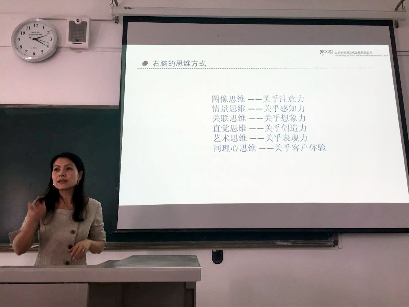 张以女士是久和邦文化发展有限公司总经理,《走向世界天下泉城》杂志总编辑,“十艺济南 创意中国”文创产品大赛总策划,长期从事广告设计创意及指导工作,有着丰富的专业实践、管理经验。张以女士从大学生毕业时面临就业择业的窘境入手分析,如何获得一个好的就业机会。详细阐释了在当今社会未来设计师所必备的六种思维,必备的专注品质、整合能力等,指出了一个优秀的设计师的定位:有设计思维的T型人才。通过本次讲座使学生更加深入体会到作为一名面向未来的优秀设计师,需要有匠心精神、跨界知识、超感觉敏锐,只有不断学习,不断实践,不断创新方能实现。本次讲座为学生进入社会实践进行了一次思想上的洗礼,激发了学生就业择业的自信心。