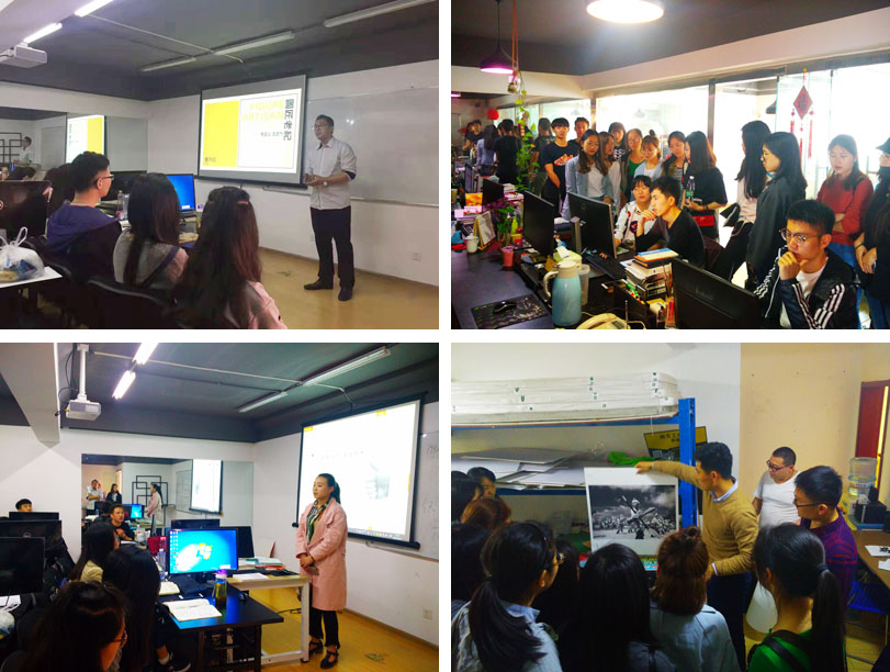 本次考察的企业分别为山东玖和邦文化发展有限公司、山东美特印刷物质有限公司和三川广告图文。在玖和邦公司考察时,公司毕主任带领师生参观了设计部,介绍了企业文化和工作流程。公司纪总监为学生们进行了一场专题讲座,就设计师职业发展的知识体系建设、信息传播中设计形式的变迁、玖和邦设计师入职训练项目进行了生动的讲解。同时,师生与在玖和邦工作的2016届毕业生张林娜同学就自身从业感受进行了交流。在美特纸业和三川广告,工作人员热情地就特种纸张的种类区别、设计稿的后期制作等知识细节进行了详细介绍。