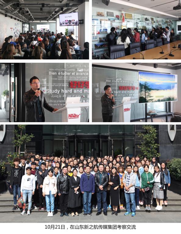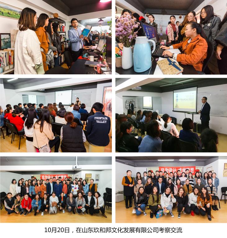 10月20日至21日,视觉传达设计教研室主任赵崇立和专业教师周静、陈媛、史磊分别带领2014级和2017级学生赴山东玖和邦文化发展有限公司和山东新之航传媒集团进行专业行业考察学习,受到玖和邦公司总经理张以女士和新之航传媒集团总经理于涛先生的热情接待。