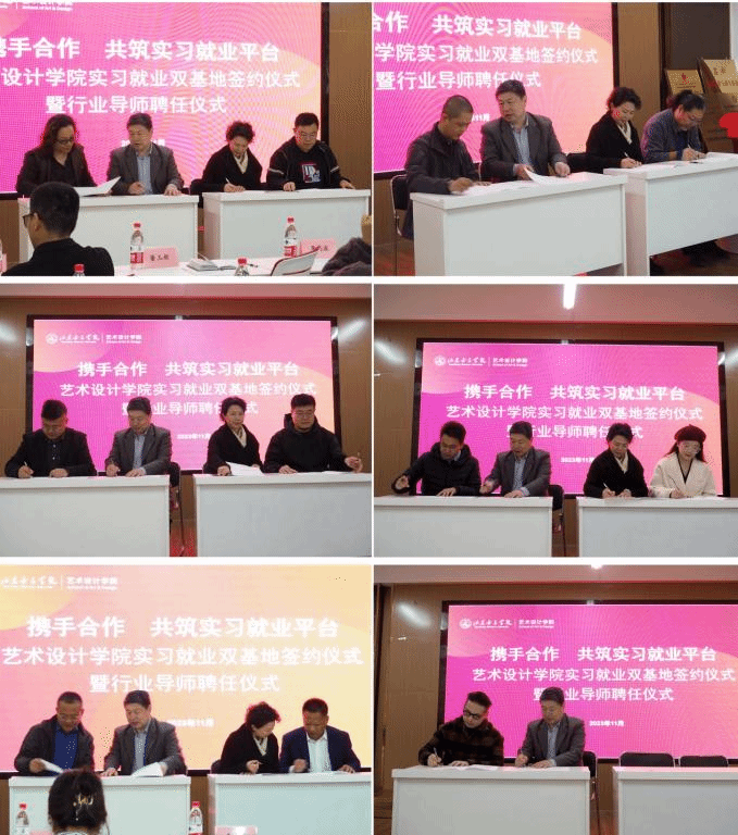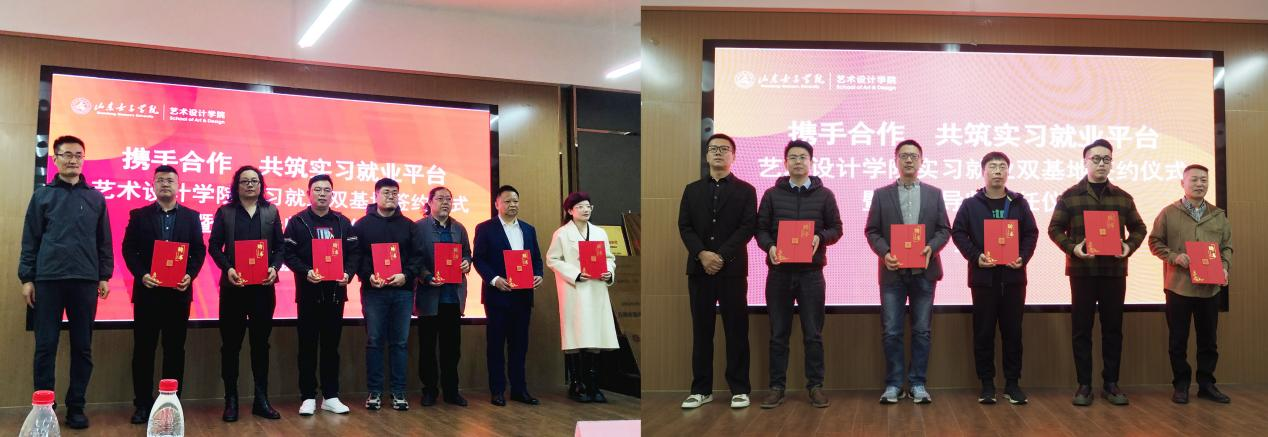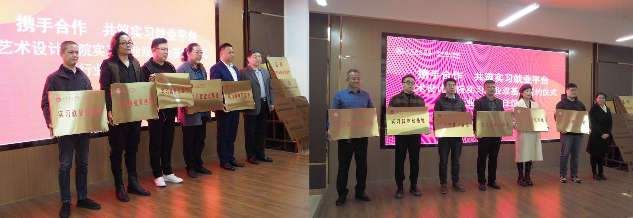 在热烈的氛围中,艺术设计学院党委书记董玉新、副院长(主持工作)赵月分别与11家设计行业企业代表正式签订了“实习就业双基地”协议并授牌。这一协议的签署,标志着双方的合作进入了新的阶段,也为学生的实习和就业提供了更多的选择和机会。为了更好地推动校企合作,学院还现场聘请了12位优秀的企业领导和资深设计师为“行业导师”,行业导师将为学生的专业学习和就业提供宝贵的行业经验和指导,为专业更好的开展实践教学提供参考。