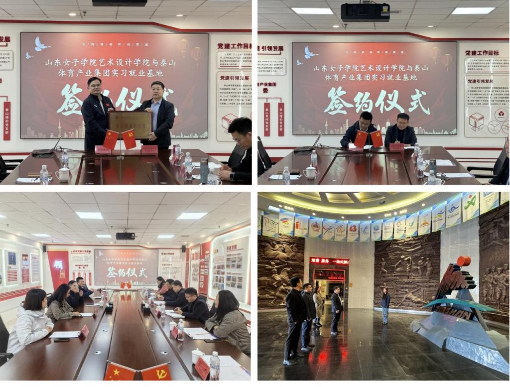 为了进一步拓宽学生实习实践和就业渠道,加强校企合作。11月6日,艺术设计学院党委书记董玉新、副书记曲常军、副院长赵崇立与产品设计教研室专业负责人陈玉、教研室主任宗杰、教师白月等,赴德州乐陵泰山体育产业集团参观考察及洽谈校企合作,并签订实习就业基地协议,泰山体育产业集团副总裁徐培明及关部门负责人出席签约仪式并陪同考察。