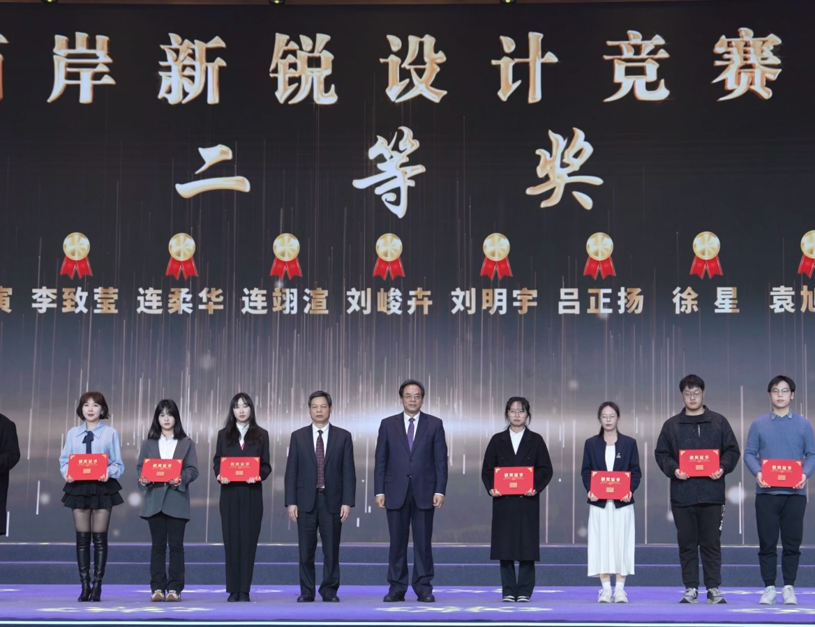 艺术设计学院教师董雪、学生刘明宇作为山东省赛区获奖代表同来自海峡两岸及港澳地区的设计院校师生、青年设计师、企业代表等一起参加了颁奖仪式。本次大赛,艺术设计学院学生在创意赛道和定向赛道中喜获国赛二等奖4项,三等奖9项,实现我校在该项赛事上的突破。其中,视觉传达设计专业刘明宇同学设计、董雪老师指导的《巨舰擎梦,向海图强》平面设计作品,以其独特的设计理念和文创的实用性,在“舰船宇宙,逐梦深蓝”定向赛道中获得国赛二等奖并应邀参加颁奖仪式。河北省政协副主席何秉群,广西壮族自治区政协副主席巫家世为获得二等奖的代表颁奖。
