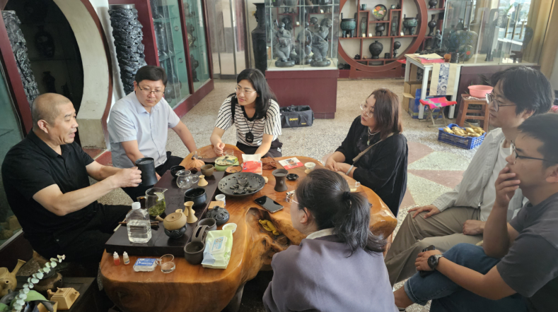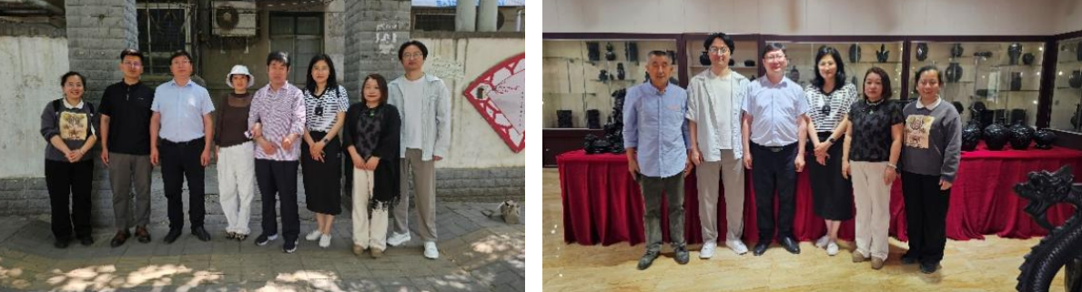 在侯氏社火脸谱传习基地和传承人工作室,调研组深入探寻了社火脸谱在社区的传承机制。传承人侯志新详细讲解了社火脸谱纹样的文化内涵和绘制技艺;在章丘区城子崖黑陶艺术馆、闵伟黑陶博物馆,非遗传承人向调研组展示了黑陶拉坯、烧制、雕刻等传统工艺,并介绍了龙山文化的历史渊源与其创新实践案例。学院调研组与传承人进行了深度对话,并参观了黑陶文化空间,梳理了项目的历史渊源、传承现状,精准把握传承人的困境与发展诉求,为后续的帮扶工作筑牢根基。