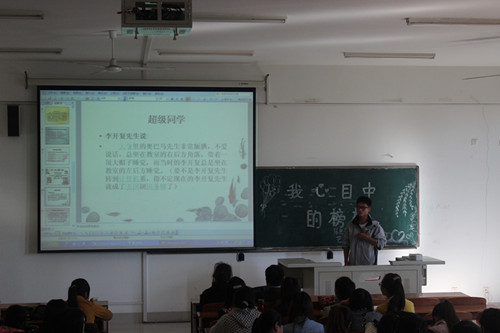 班会开始,武凯老师首先向大家说明了召开本次班会的目的,这是一次跨学院跨专业、不同年级同学间心与心的交流,他希望大家畅所欲言,得到真正的教益。接下来,两个班级的学生代表以“我心目中的榜样”为主题,依次上台讲述了自己的榜样,以及榜样对自己起到的积极意义。大家的榜样各不相同,既有国家领导人,又有感动中国人物、知名成功企业家,还有生活在自己身边的人,虽然榜样各不相同,但是榜样带给他们的积极力量是相同的。学长学姐还给环艺设计二班交流了对大学的理解和感悟,鼓励大家要珍惜大学生活,树立榜样,过积极健康的大学生活。