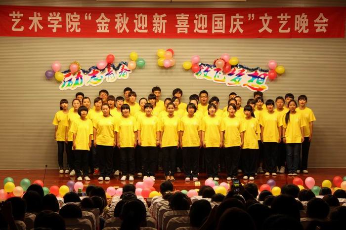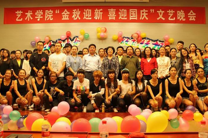 9月28日,在艳阳高照、举国喜迎建国63周年之际,艺术学院在图书馆一楼报告厅举行“金秋迎新,喜迎国庆”文艺晚会。学校纪委书记汪琦出席晚会并与学院领导、师生合影留念,艺术学院党总支副书记和副院长,辅导员、班主任和部分专业教师代表,以及2012级新生和2010级2011级部分同学参加了晚会。