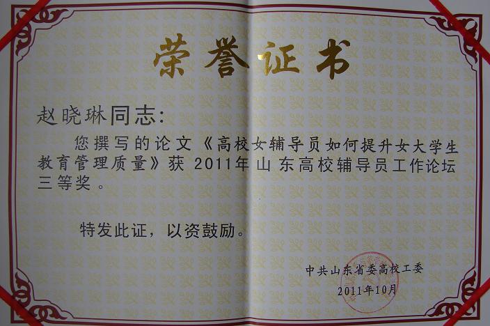 为深入贯彻中央16号文件和胡锦涛总书记“七一”重要讲话精神,不断推进高校辅导员队伍建设,提高育人水平和工作质量,省委高校工委与教育部高校辅导员培训和研修基地(山东大学)于11月2日至3日在山东理工大学举办了2011年山东高校辅导员工作论坛。本届论坛主题是“科学研究、内涵发展,全面提高辅导员工作质量”,我院辅导员赵晓琳老师的论文《高校女辅导员如何提升女大学生教育管理质量》在此次论坛上荣获三等奖。