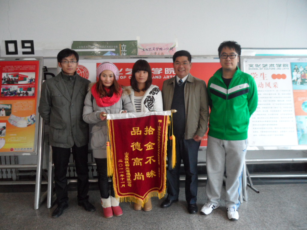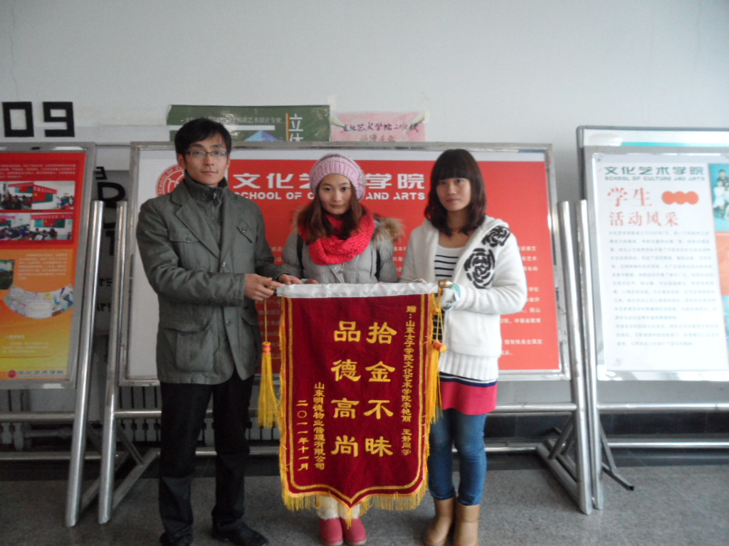 2011年12月1日,明德物业公司张经理手捧锦旗和表扬信来到文化艺术学院,当面向我院老师和同学们感谢拾金不昧的好学生李艳丽和王静,引来全院师生的一片称赞。