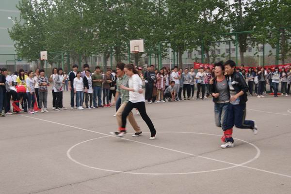 本次活动包括跳绳、呼啦圈、两人三足跑和趣味接力跑等项目。此前,我院学生会体育部组织参赛班级精心选拔了各个项目的参赛选手,并积极组织开展了针对性训练,保证选手们以积极的竞技状态和精神风貌参加比赛。在两人三足跑比赛中,选手集中精力、默契配合,高呼着“一二”的口号,整齐划一的大步前进,场上同学们的默契配合和奋力拼搏,博得了场下同学的阵阵喝彩。在最为竞争激烈的趣味接力跑比赛中,10级新闻、09级环艺、10级装潢分获冠、亚、季军。全场气氛热烈,场外的加油助威声此起彼伏,掌声雷鸣不断。赛场上不时迸发着青春的激情和活力,为春天的校园增添了一份欢乐和谐、积极向上的色彩。