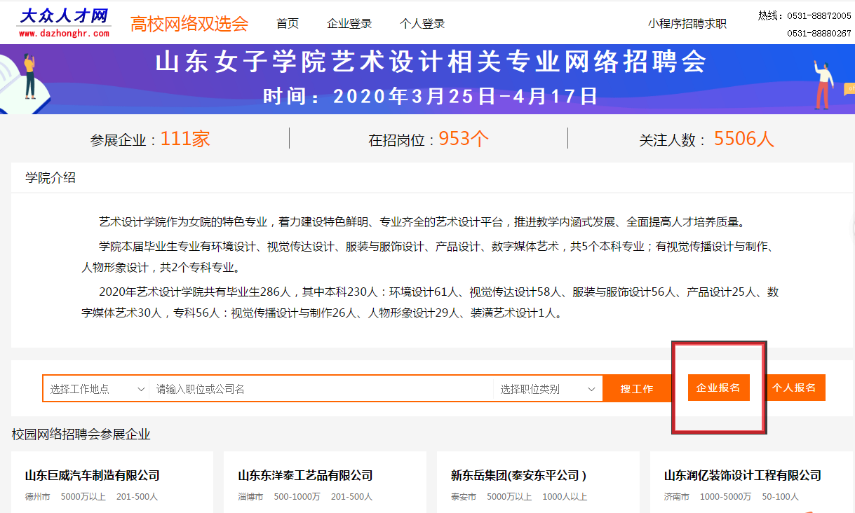 进入山东女子学院艺术设计相关专业网络招聘会页面,选择单位信息进行报名申请。