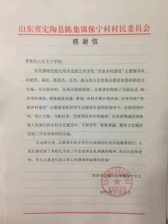 11月11至12日,艺术学院“美丽乡村建设”志愿服务队,利用周末时间,再次深入菏泽市定陶区保宁村,配合支持“第一书记”工作,彩绘百姓大舞台,宣传践行十九大会议精神。