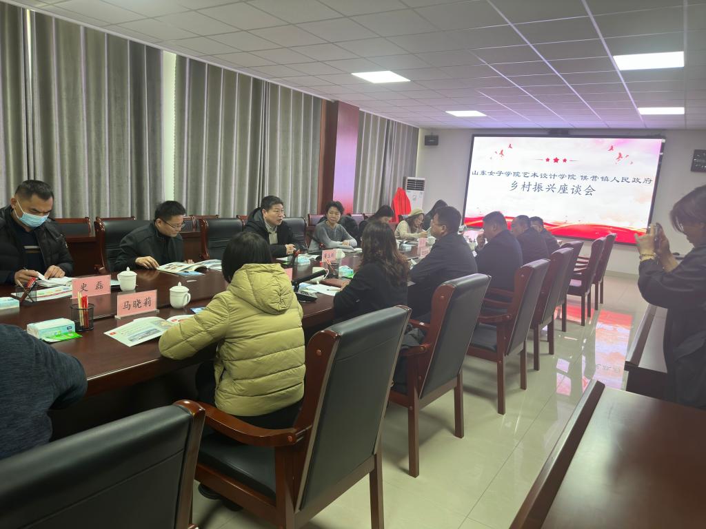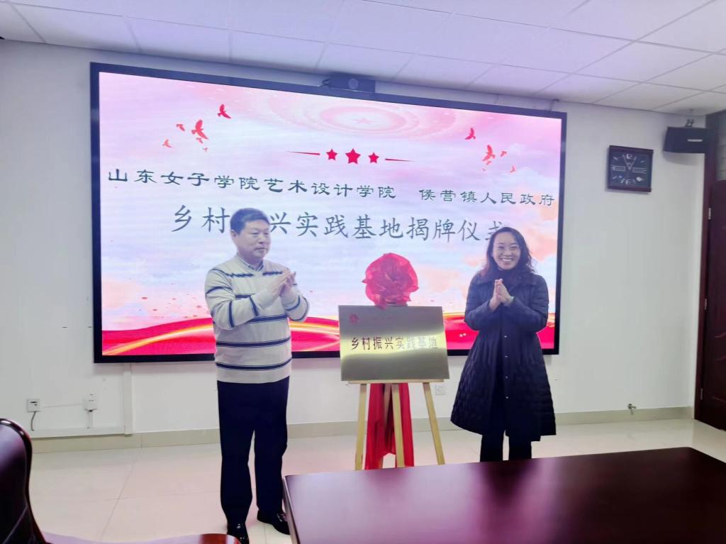 调研结束后,双方举行座谈会,会上,东昌府区委副书记谢炜对艺术设计学院调研团队一行的到来表示欢迎,希望双方要进一步加强产学研合作,搭建高校、企业互动交流合作平台,促进“政府+企业+高校 ”间信息和资源共享。董玉新书记在会上介绍了山东女子学院的优势特色以及艺术设计学院在设计教育方面的深厚积淀和优秀实力,并对侯营镇在乡村振兴和基层治理工作上的创新和努力给予了肯定。赵月副院长表示,在推动学校相关专业、技术、人才与企业发展需求的高效衔接中,企业是“出题人”,学校是“答题人”要把我校的科教资源融入侯营镇企业乡村振兴的创新发展之中,做深做透产教融合文章,努力产出促进双方高质量发 展的高水平合作成果。会上,双方就人才培养、师资共享共用、科研平台共建、成果转化等方面展开深入探讨交流。最后,在热烈的氛围中,董玉新书记和臧玮书记共同为侯营镇“ 乡村振兴实践基地 ”揭牌并合影留念。